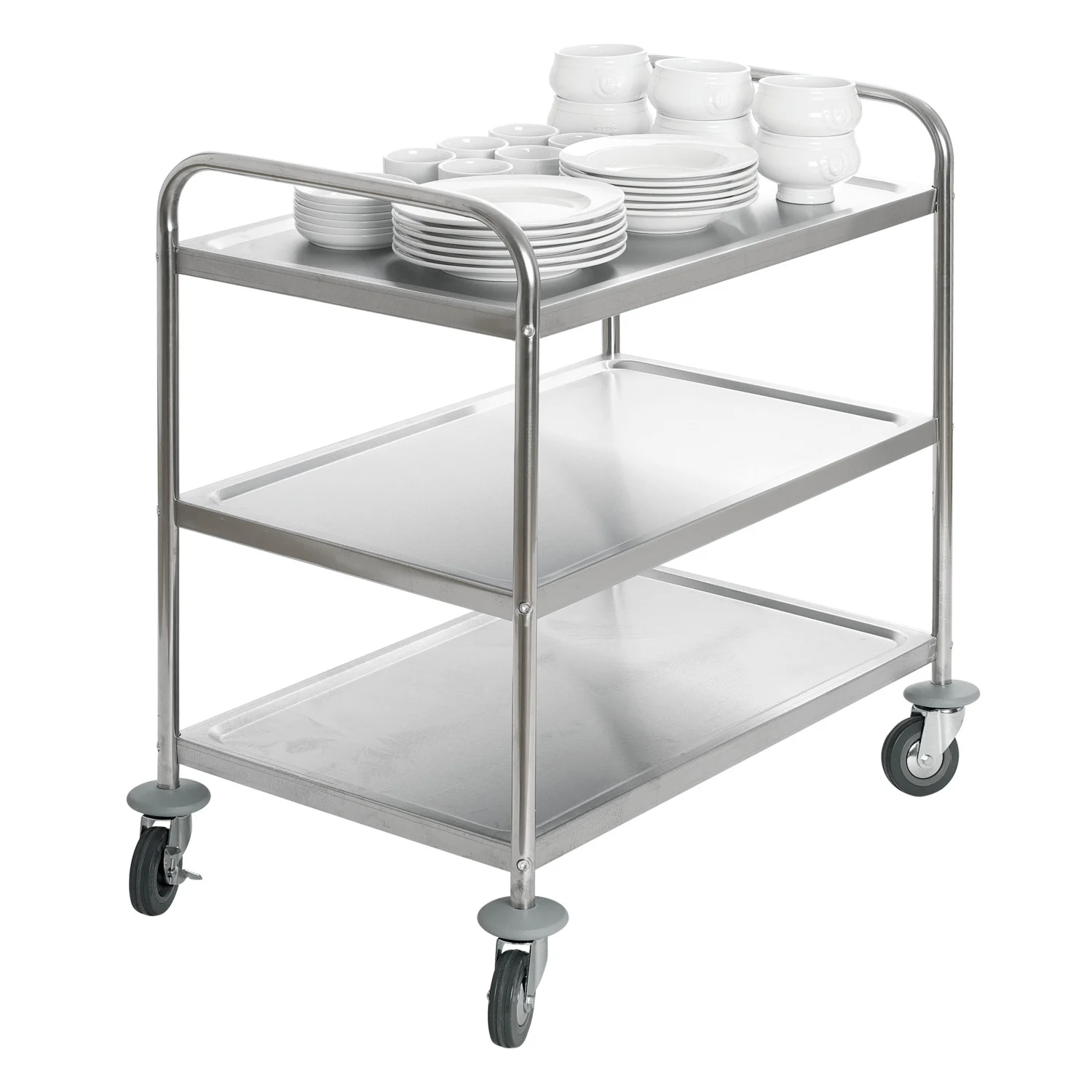 Carrito transportador de acero inoxidable. De tubos y bandejas profundas. Estructura muy estable y seguro a la hora de desplazarse. Ruedecitas PVC Ø 10cm, ancho ruedecita 3 cm. Cuatro ruedecitas direccionales tratadas contra la corrosión, dos de ellas con freno. De fácil montaje.