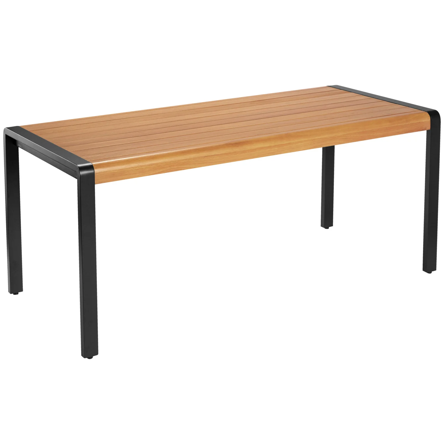 Mesa de exterior en una mezcla de materiales de marco de aluminio y madera maciza de eucalipto certificada FSC® con diseño de teca. Especialmente lacado. Robusto y resistente a la intemperie. Diseño innovador combinado con una gran ergonomía gracias a los bordes redondeados. Apto para uso interior y exterior. Dispositivo para fijar antirrobo (cable de acero) en la parte inferior. Los bancos Listello a juego pueden colocarse debajo de la mesa para ahorrar espacio. Se suministra desmontado. Fácil montaje, material de fijación incluido. No te olvides de pedir los bancos y sillas a juego.