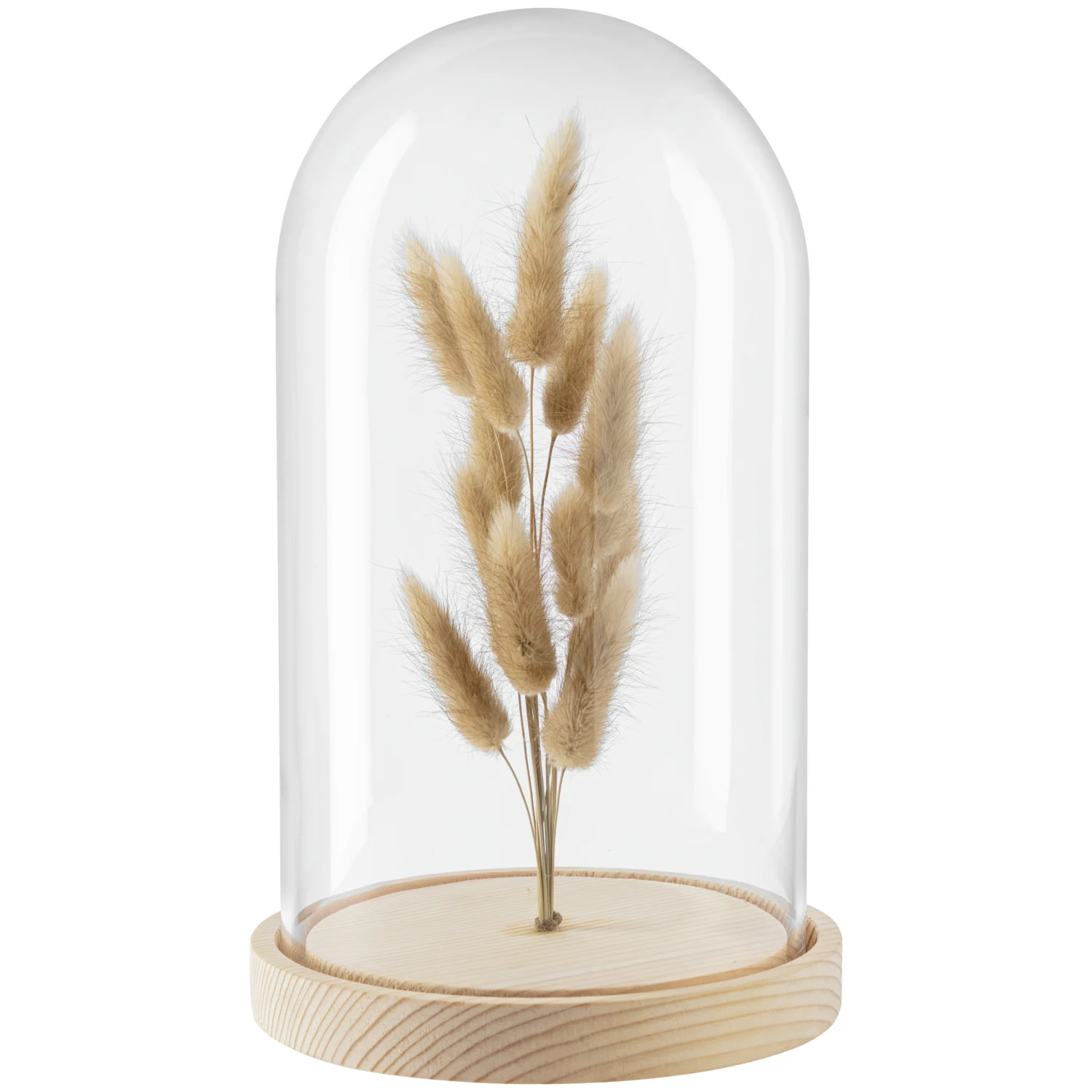 Pieza decorativa moderna, con base de madera y campana de cristal. Interior con flores secas. Las flores secas están fijadas a la base de madera, de modo no se mueven.